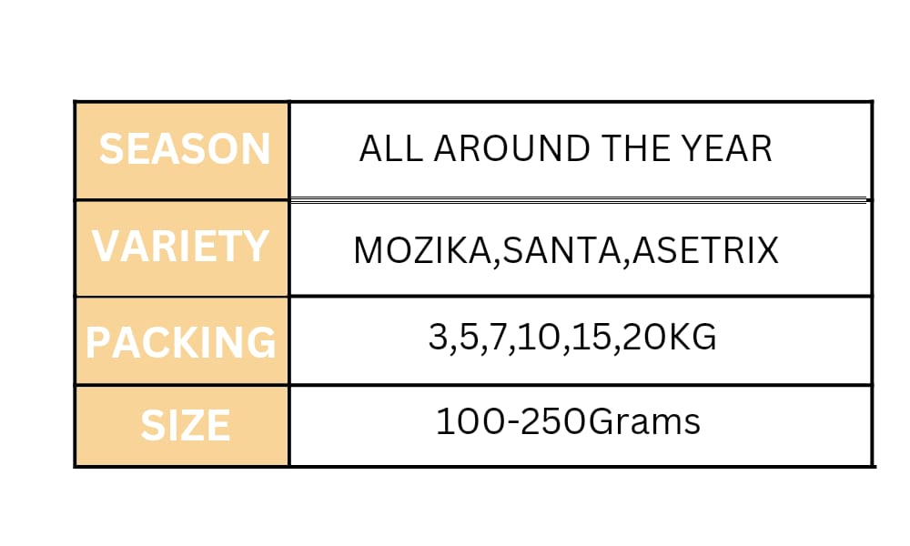 Mozika Potatoes have highest consumer potential and is the vegetable which is not in any sense any less nutritious or delicious. It has a huge amount of admirers present in every age group. It is used in almost every genre of food, from junk food to traditional healthy food. The iron, phosphorous, calcium, magnesium, and zinc based potatoes are imported and exported from Pakistan in great rates and with amazing facilities. DELUXE is well known for the export of best quality of Mozika Express potatoes.